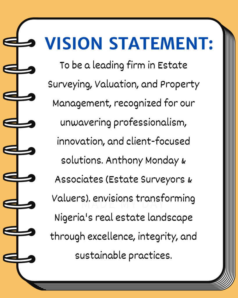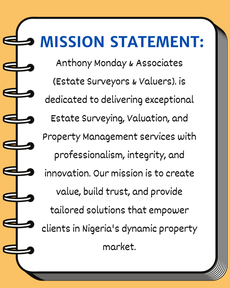 Anthony Monday & Associates is a reputable professional company specializing in Estate Surveying, Valuation, and Property Management. Recognized by the Nigerian Institution of Estate Surveyors and Valuers (N.I.E.S.V) and duly registered with the Estate Surveyors and Valuers Registration Board of Nigeria (E.S.V.R.B.N), the company is fully licensed to provide comprehensive services in line with industry standards